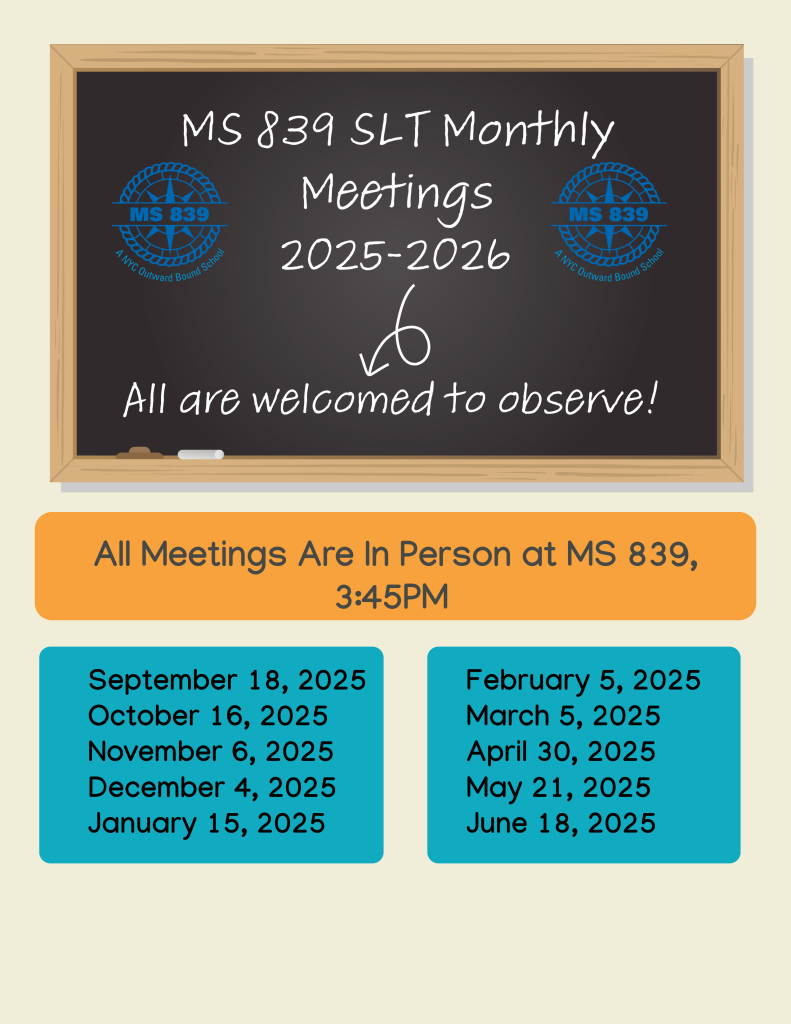 Like all NYC public School Leadership Teams, our School Leadership Team (SLT) is made up of equal representation of administration, staff and parents. Our SLT works collaboratively each year to define one or more schoolwide goals or projects during monthly meetings. Some examples of SLT goals have been creating more opportunities for students to engage in community service, the creation of a fieldwork directory as a resource for staff & parents, and exploring issues of diversity in our school. The SLT meets once a month.