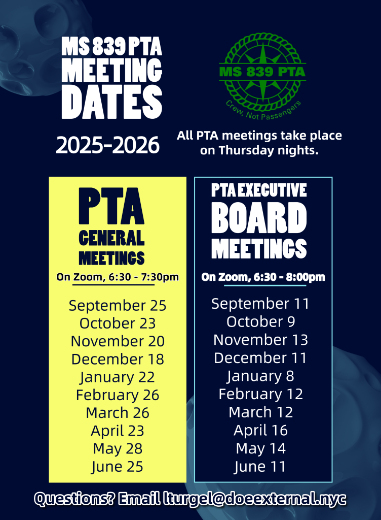 The PTA raises funds for expenses at the school that serve all students. Please be on the lookout for our 2025-2026 Annual Fundraising Appeals. Please know that you are a critical part of our MS 839 community and there are SO MANY ways you can participate: Attending school EVENTS (potlucks, dances, PTA meetings); VOLUNTEERING for an event or committee; DONATING to fundraisers; and most importantly doing the nonstop but rewarding work of PARENTING.