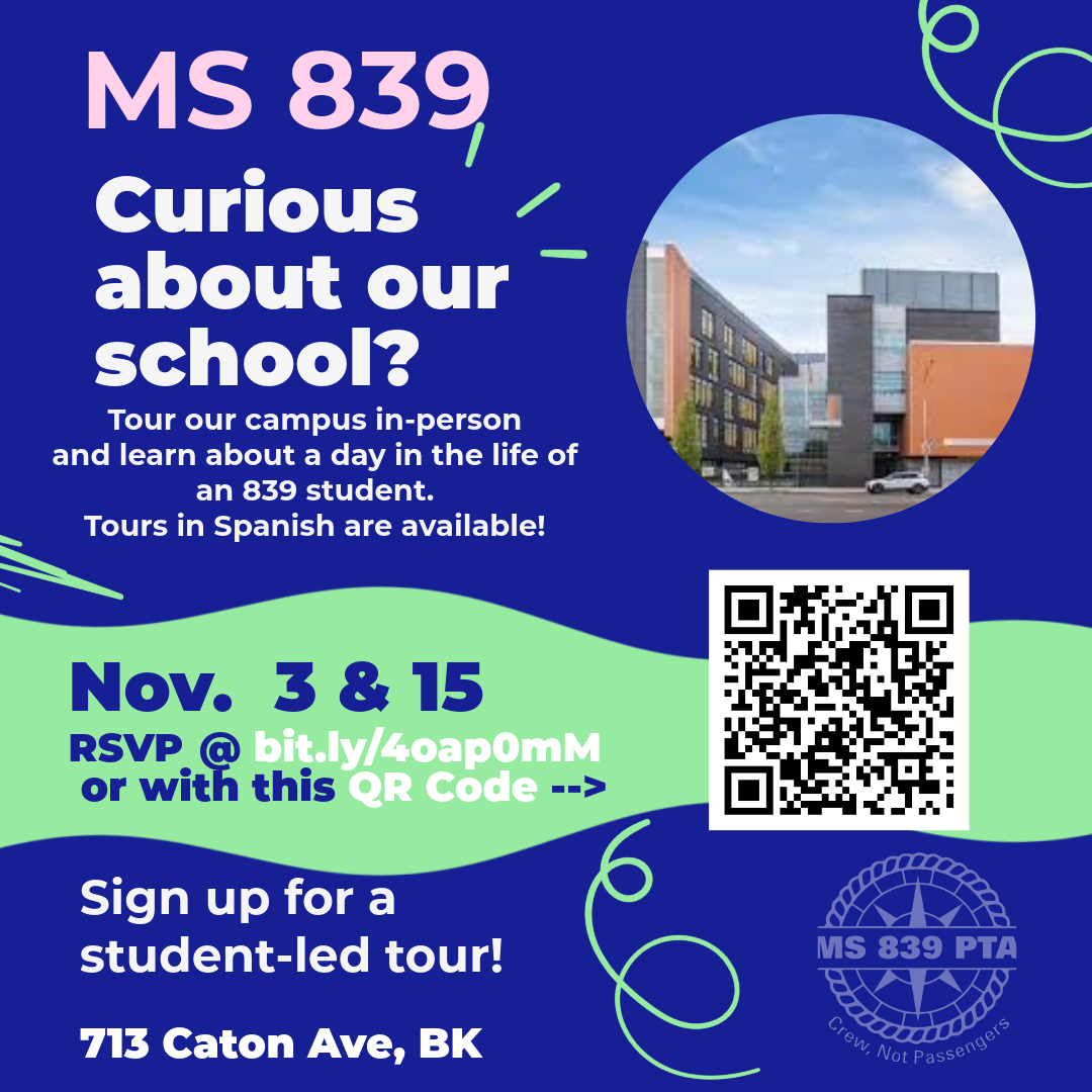 We are hosting building tours on Nov. 3 and Nov. 15. Families can RSVP at bit.ly/4oap0mM or through the QR code on the flyer below.